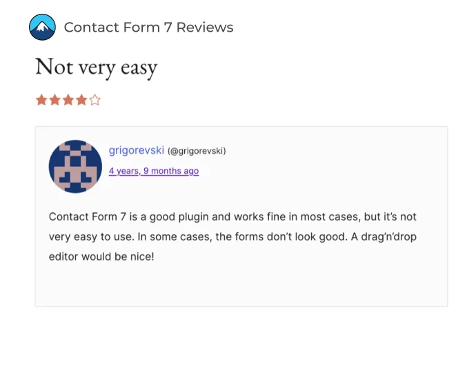 Customizing and configuring a contact form in CF7 requires writing HTML and CSS. There’s no visual editor, thus you’re stuck with a generic form look unless you dive into custom code. If you want to make a form that matches your website style, be ready to add extra plugins or work with CSS. In short, CF7’s users always comment on the necessity of a more customizable, modern design