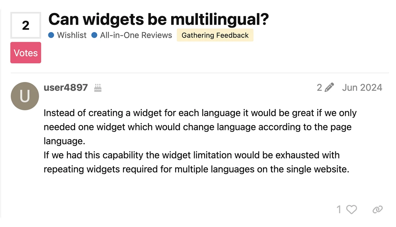 Elfsight offers a broad array of widgets, but when it comes to conversion optimization features, it has some gaps. Elfsight lacks built-in A/B testing, so users have no easy way to test which widget actually performs better. Multilingual support is also inconvenient — you need to create a separate widget for each language, which quickly eats into your widget limits and adds extra work. On top of that, Elfsight’s display rules are very basic, making it impossible to set up advanced scenarios like cart abandonment recovery or traffic source targeting.