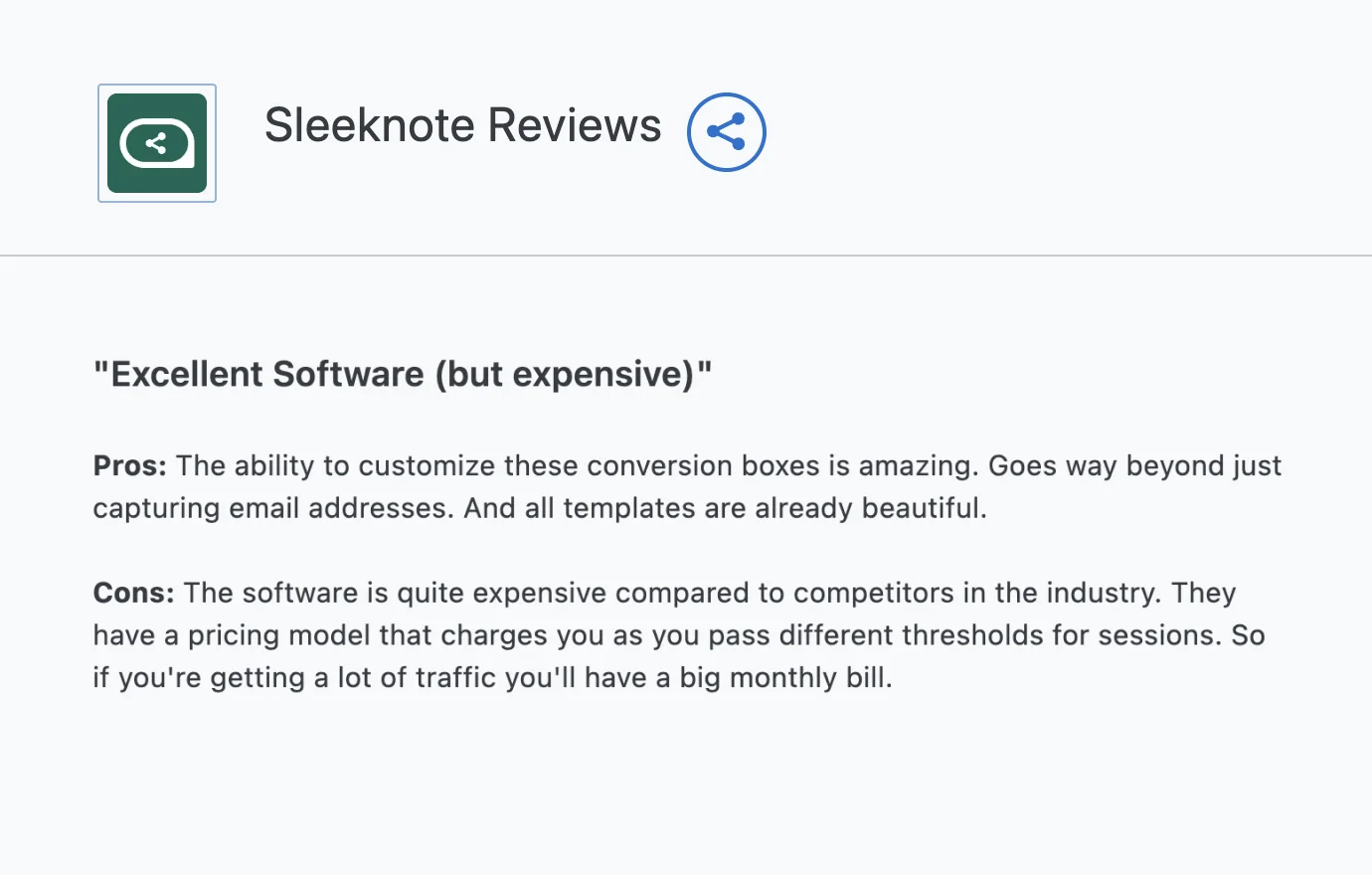 Pricing. GetSiteControl emerges as a budget-friendly Sleeknote alternative with monthly pricing plans ranging from $9 to $29. However, it's important to note that the $9 plan covers only the simplest and most basic features, which might not suffice for optimal results. In contrast, Sleeknote's cheapest plan, though priced at $62, provides access to all functionality from the get-go.