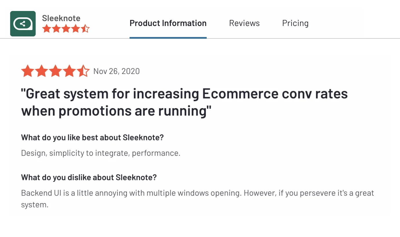 Simplicity. GetSiteControl, much like Sleeknote, offers a user-friendly platform that's particularly suitable for beginners. However, if you're accustomed to a drag-and-drop editor, it's worth considering other Sleeknote alternatives, as GetSiteControl lacks this specific functionality.