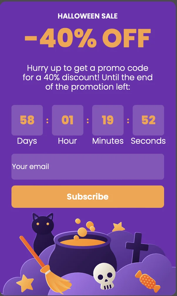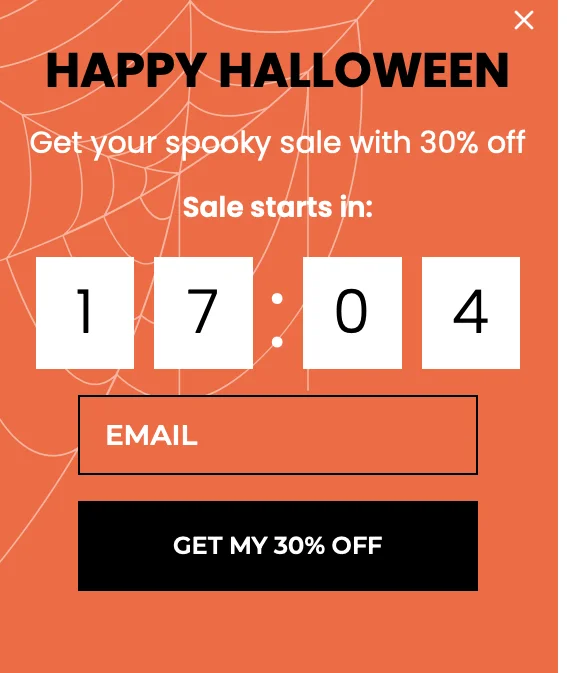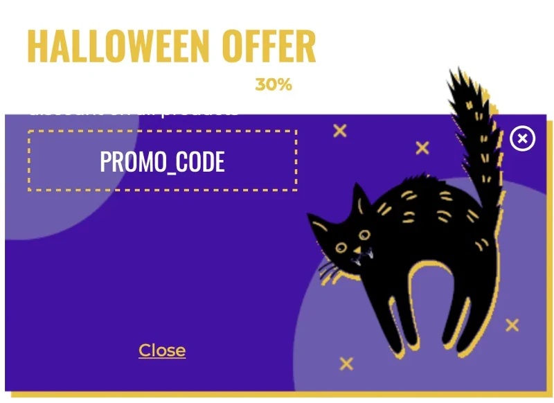 We recommend using Halloween pop-ups, that give customers special discounts, savings, early access to specials, and other incentives that can entice visitors to buy from you.