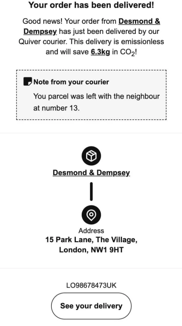 This Quiver delivery confirmation is brief and to the point, stating that the parcel was delivered, as well as the delivery location. It also includes an area for the courier to provide any critical delivery notes, in addition to the email address for customer service.