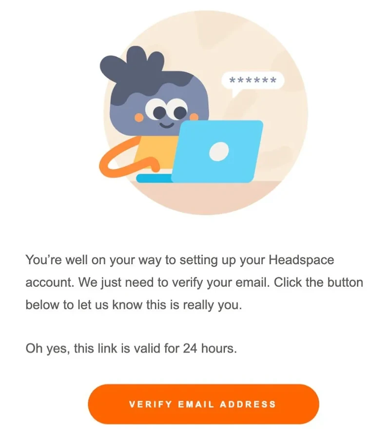 This Headspace account verification message covers the essential information recipients want, such as when the verification link will expire, why the client needs to verify their account, and what they must do to complete the process.