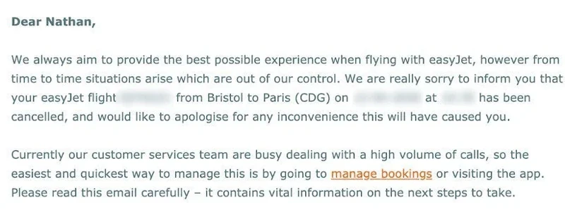 This transactional email example from easyJet displays the booking reference and itinerary for the canceled flight, as well as fast links to their customer care and manage reservations pages, allowing the client to quickly find a solution.