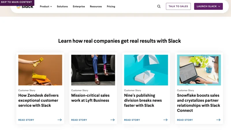 Case studies can be very useful for content marketing ideas, but that doesn't mean they have to be simple, boring, and promotional. For example, Slack took their case studies into inspirational stories.