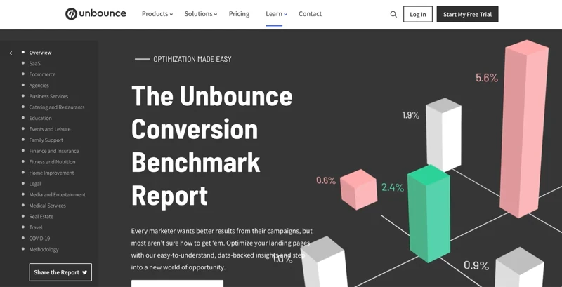 Unbounce is a landing page builder. Their conversion rate report is a single page that helps marketers increase conversions. To access the report and view this data, you need to fill out the form located right on this page.