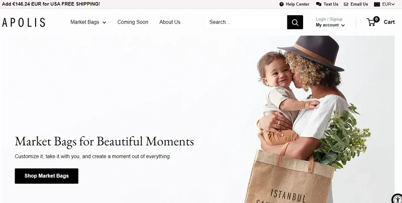 This customizable market bag store illustrates that your bar’s layout does not have to be conventional. Naturally, you place your discounts and offers in the center. Yet, when you place them in the left upper corner right above the logo, you might even increase its visibility. In addition, you can use the other corner to add some site features, such as contact links & currency preferences, to save space and mask the pop-up as an inherent page element.