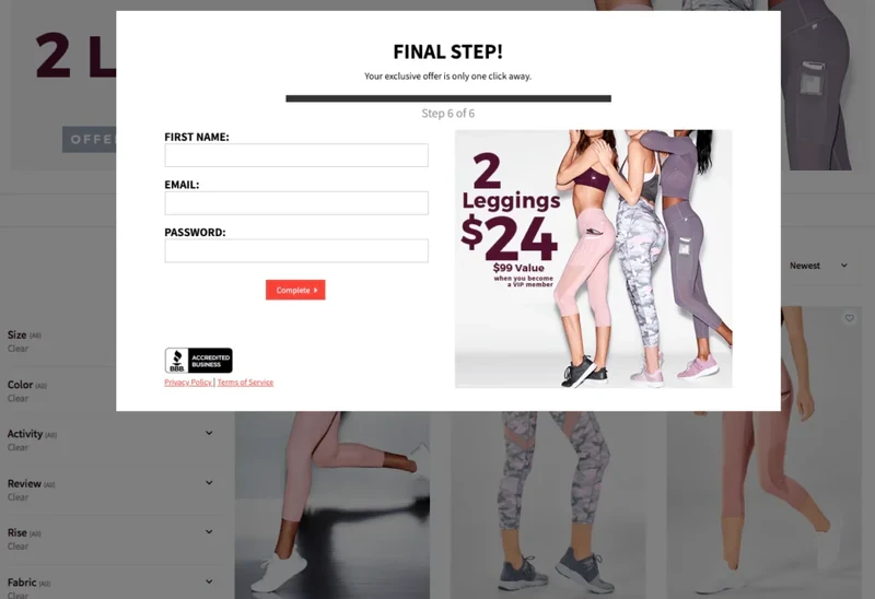 If you're new to Fabletics, they'll introduce you to a special deal, "2 leggings for $24", which you can claim by clicking "Get started". When you click the button, a six-step survey appears, in which you are asked about your workout preferences, body type, size information, and other details.