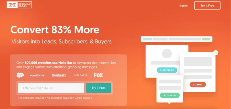 Hello Bar is an excellent alternative to OptinMonster that offers a user-friendly pop-up builder. It focuses on using attention-grabbing bars that you can strategically place on your website to capture visitors' attention and encourage them to take action. Hello Bar provides advanced targeting options based on user behavior, referral source, and scroll depth, ensuring that your pop-up reaches the right audience at the right time. The platform integrates seamlessly with popular email marketing platforms and CRMs, allowing you to easily manage and nurture your leads. You can also use Hello Bar for A/B testing and conversion tracking to optimize your campaigns and maximize conversion rates. By using Hello Bar, you can create compelling pop-ups that drive engagement and achieve your campaign goals.