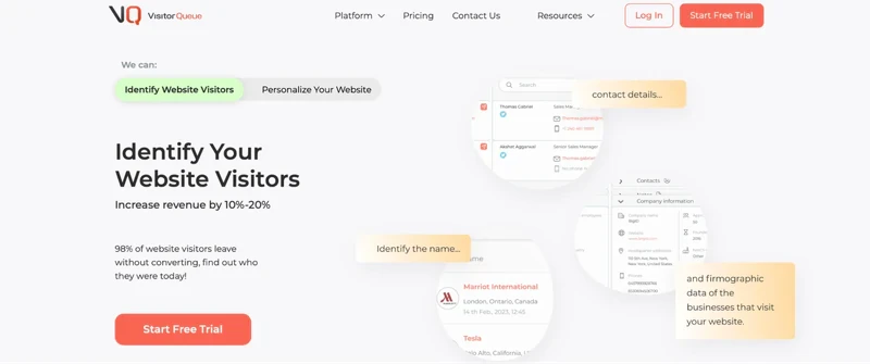 Visitor Queue offers a 14-day free trial. Their pricing plans start at $31/month for up to 500 unique leads and vary based on lead volume and additional features.
