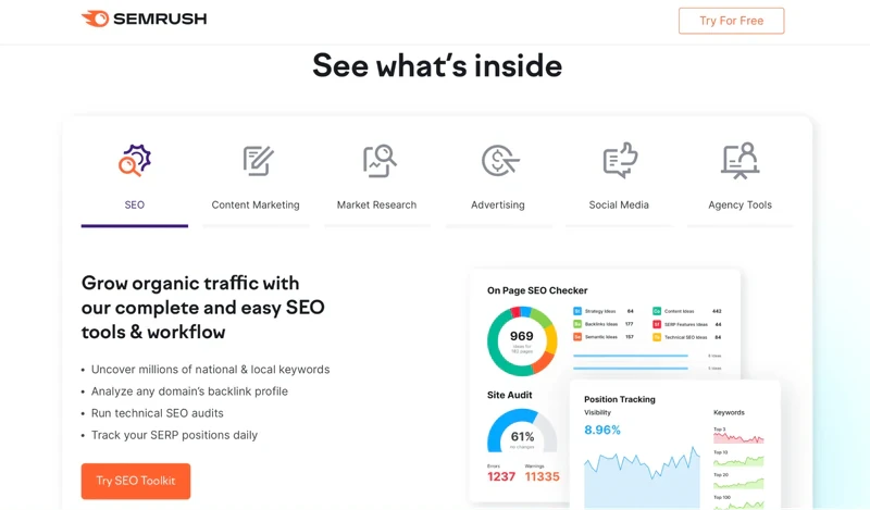 SEMrush is primarily known as an SEO and competitive research tool, but it also offers content marketing features. It provides content ideation, topic research, SEO optimization recommendations, content performance analysis, social media tracking, and more. SEMrush helps optimize content for search engines and improve overall content marketing efforts.