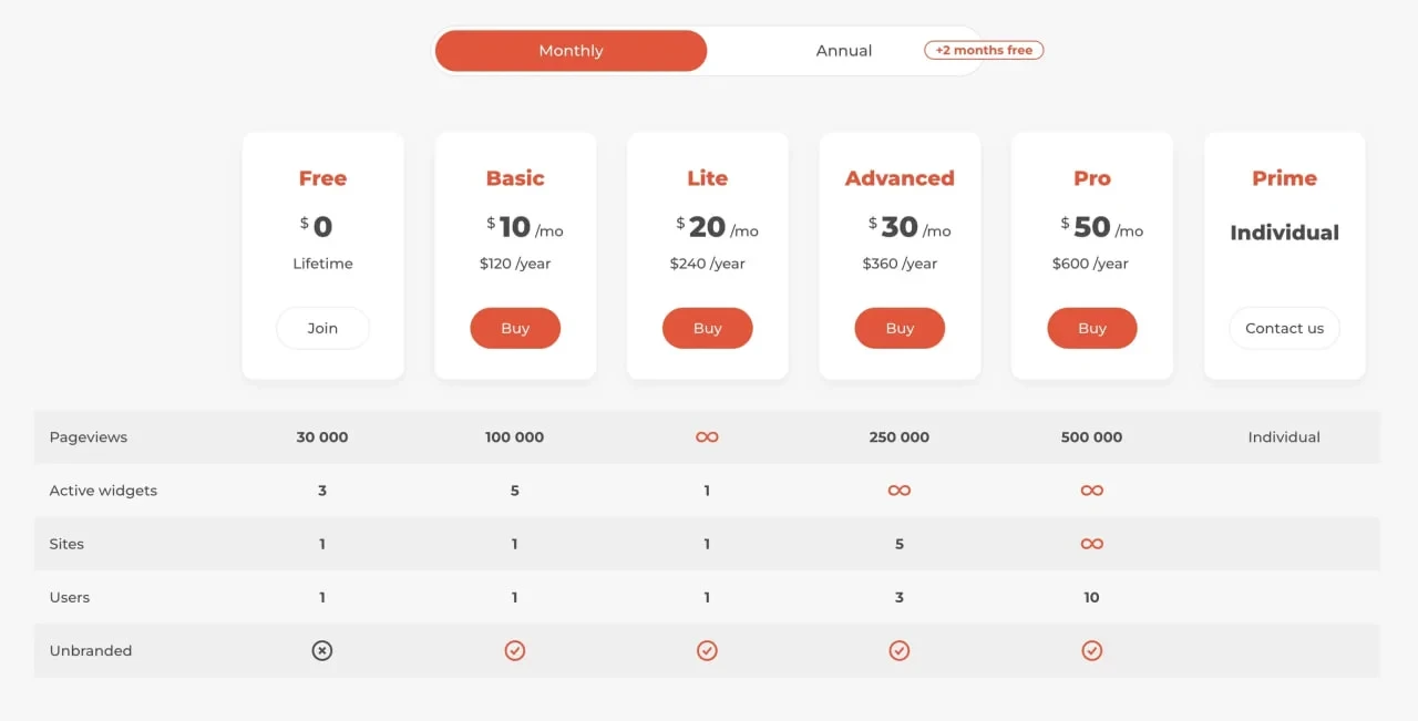 As your traffic grows, you can increase your conversions even more effectively with our awesome widgets by subscribing to an affordable plan. We don't tie our clients' hands and offer a range of pricing plans, both monthly and annual:
