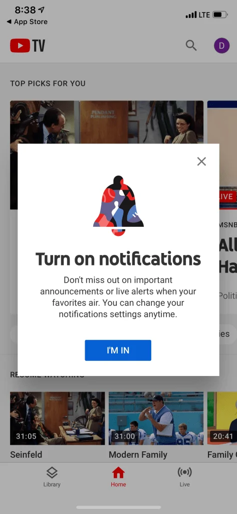 YouTube's permission request is one of the best pop-ups. Instead of asking for permission without context, the app positions notifications as a required feature. Messages effectively communicate the benefits of push notifications and play on users' fears of missing out.