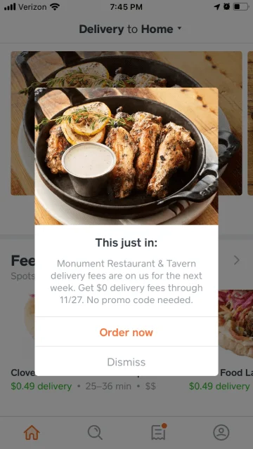 Caviar uses users' location information and application settings to generate personalized in-app messages. Caviar uses an overlay to promote new restaurants, letting users know that delivery charges from a new, nearby restaurant are free for a limited time. An enticing image catches the eye and gives hungry users a reason to browse.