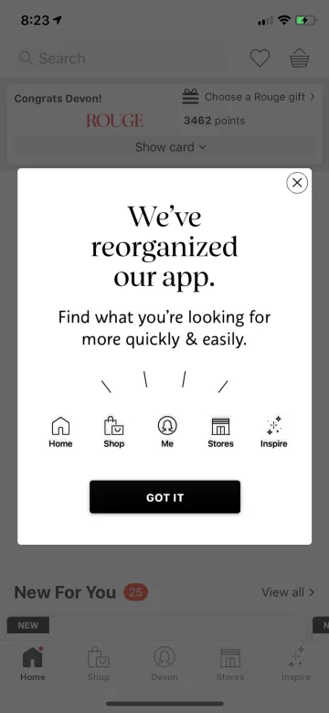 Sephora used a fantastically simple pop-up to inform users of the app's menu changes. We like that this quick start guide doesn't allow for much interpretation and emphasizes that a conscious improvement has been made to the user's navigation.