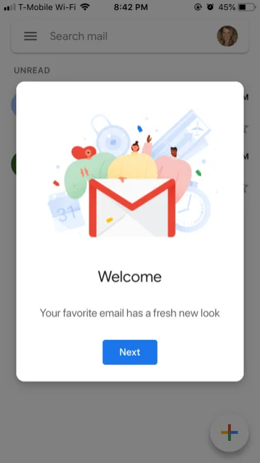Gmail has used in-app message overlays to communicate some important UI update news to users. The app has been given a new look with three different layout options. In this example, Gmail communicates the message with consistent branding and concise copy, creating a compact embedded environment that engages and informs the user.