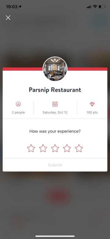 Using a mobile pop-up as a feedback portal is a smart and efficient way. It serves as a reminder that the app was helpful to the user (last restaurant reservation) and is effective because using a small overlay gives users the impression that it will be a quick and easy experience.