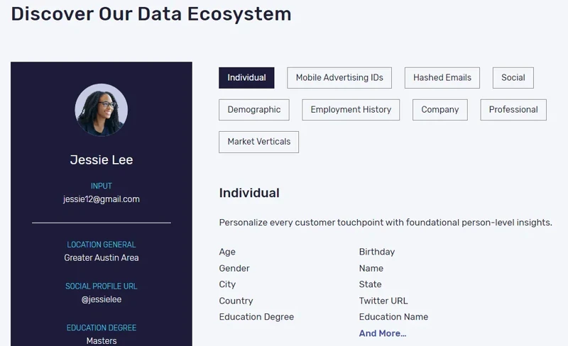 Assists in augmenting profiles (names, phones, addresses, social media profiles, behavior patterns, etc.) and matches you with potential buyers.