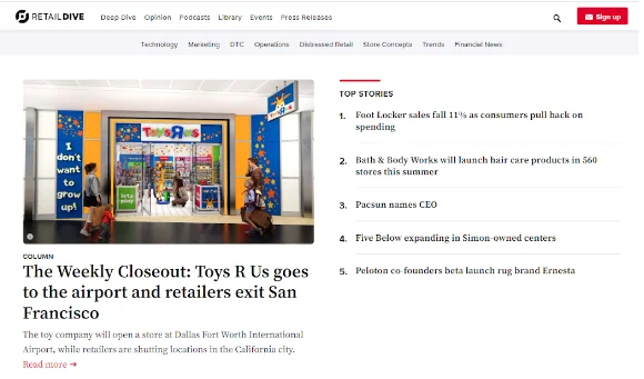 Retail Dive highlights news and insights on the retail industry, including e-commerce. The blog covers topics about online shopping trends, consumer expectations, retail technology advancements, and industry disruptions.