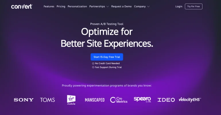Pricing is transparent and predictable. Plans start at $299 a month for up to 100,000 tested users on the annual plan. Convert offers a 15-day free trial.