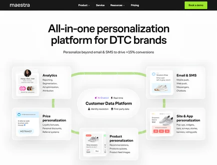 Maestra is an all-in-one personalization platform for e-commerce marketing that replaces a patchwork of separate tools with one unified system. Unlike tools that handle one or two channels, Maestra combines a real-time CDP, omnichannel messaging, on-site personalization, AI-driven recommendations, loyalty, promo, and referral engine, and full-funnel analytics — all sharing the same data layer.