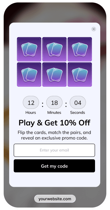 Users flip cards to find matching pairs and unlock a reward once they finish. Each click keeps them involved, so more people go all the way to the end and actually use the reward — while naturally spending more time on your site.
