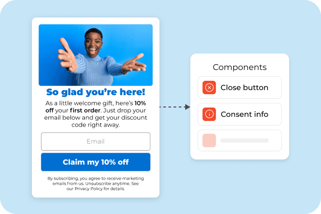 Add a few simple elements that make people feel comfortable — a short reassurance, a visible close button, and consent checkboxes. These small things help reduce hesitation and make the decision easier.